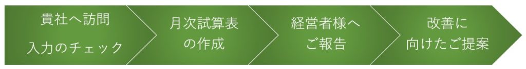 毎月、貴社を訪問し、前月分の経理内容をチェックし、月次試算表を提供します。