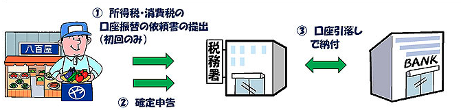 | 3 | 振替納税(個人のみ) | ・申告書の提出で完結 ・納付期日に余裕がある | ・初回に振替依頼書の提出が必要 ・個人の申告所得税と消費税のみ利用可能 |
