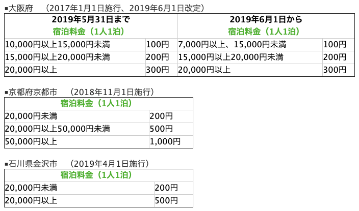 | 税率(1人1泊) | 税抜の素泊まり料金が、 10,000円未満は「非課税」 10,000円以上15,000円未満は「100円」 15,000円以上は「200円」 |