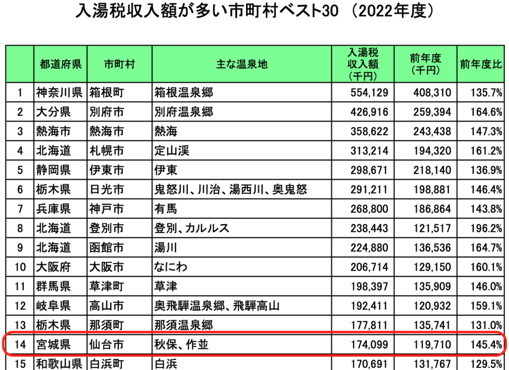 日本温泉協会の「入湯税収入額が多い市町村ベスト30(2022年度)」によると、宮城県の市町村では仙台市が14位に入っており、1億7,400万円の税収となっています。
