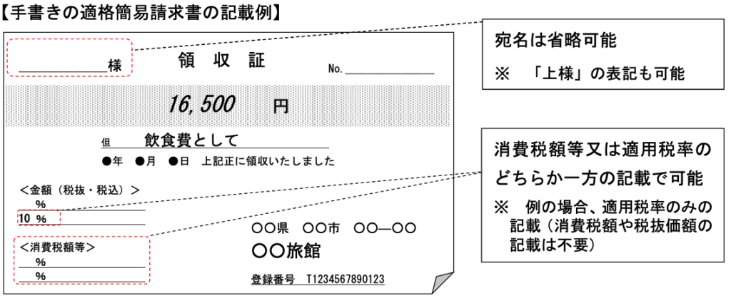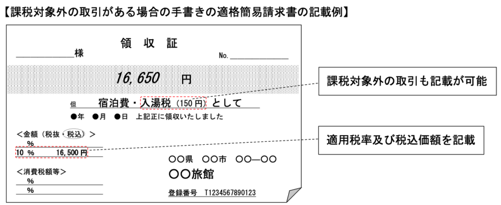 問58-2 当社は旅館を経営しており、企業に懇親会でご利用いただくこともあります。領収書の発行を求められたときには手書きで領収書を作成し、交付してきました。これを適格請求書等とするためには、宛名や税率ごとの対象金額・消費税額を明記して交付しなければならないのでしょうか。また、温泉に入浴した顧客から受け取る対価には入湯税など課税対象外のものも含まれていますが、どのように記載したらよいでしょうか。【令和6年4月追加】