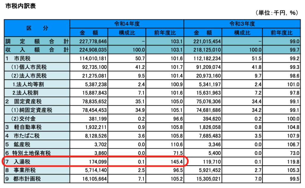 税収全体の2,200億円に占める割合は小さいですが、入湯客144万人に対して1回70円や150円を地道に積み上げた結果の1億7,400万円と考えると、貴重な税収ですね。